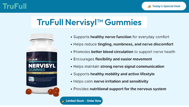 TruFull Nervisyl Gummies provide a convenient and natural way to support nerve health. With a blend of essential nutrients and plant-based compounds, they aim to reduce discomfort, improve mobility, and promote overall nervous system wellness. However, results can vary, and they should be used as part of a healthy lifestyle rather than a replacement for medical treatment.